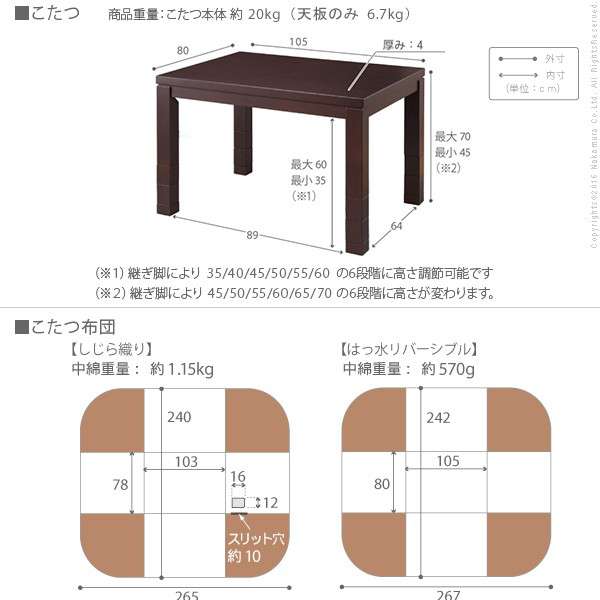 【サイズ】 ■こたつ本体 幅105x奥行80x高さ45/50/55/60/65/70cm(継ぎ脚10cmx2個、5cmx1個) 重量:約20kg ■こたつ布団 265x240cm・中綿約1.15kg 【仕様】 薄型石英管ヒーター(中間スイッチ式) ヒーター消費電力:500W コード長さ:約3m 関連キーワード 80センチ 80cm 105 105センチ 105cm センターテーブル リビングテーブル 勉強机 コタツテーブル こたつテーブルセット コタツテーブルセット コタツ布団セット 布団セット こたつ布団 コタツ布団 炬燵布団 足 脚 一枚板 ロー 低い 上掛け カバー 掛け布団 クッション 軽量 コンセント サイズ 最安値 薄掛け 座る スイッチ 綿 ソファ ソファー 組み合わせ 小さいサイズ 大きめ 天板 布団 モダン ミニサイズ 毛布 リビング ローソファ ローソファー 掛け ごろ寝 座椅子 北欧風 座布団 腰痛 デスク ビンテージ ビンテージ風 ヴィンテージ 和風 和室 2人用 おしゃれな 省エネ 子供 コンパクト カントリー 木 座卓 パソコン 食事 和モダン インテリア ミニサイズ オシャレ スリム ハイ 高い 高い 高いテーブル ダイニング ダイニングテーブル 高さ調整