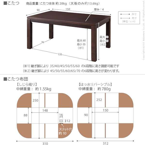 【サイズ】 ■こたつ本体 幅150x奥行90x高さ45/50/55/60/65/70cm(継ぎ脚10cmx2個、5cmx1個) 重量:約28kg ■こたつ布団 310x250cm・中綿約1.55kg 【仕様】 薄型石英管ヒーター(中間スイッチ式) ヒーター消費電力:500W コード長さ:約3m 関連キーワード 150センチ 150cm 90センチ 90cm センターテーブル リビングテーブル 勉強机 コタツテーブル こたつテーブルセット コタツテーブルセット コタツ布団セット 布団セット こたつ布団 コタツ布団 炬燵布団 足 脚 一枚板 ロー 低い 上掛け カバー 掛け布団 クッション 軽量 コンセント サイズ 最安値 薄掛け 座る スイッチ 綿 ソファ ソファー 組み合わせ 小さいサイズ 大きめ 天板 布団 モダン ミニサイズ 毛布 リビング ローソファ ローソファー 掛け ごろ寝 座椅子 北欧風 座布団 腰痛 デスク ビンテージ ビンテージ風 ヴィンテージ 和風 和室 2人用 おしゃれな 省エネ 子供 コンパクト カントリー 木 座卓 パソコン 食事 和モダン インテリア ミニサイズ オシャレ スリム ハイ 高い 高い 高いテーブル ダイニング ダイニングテーブル 高さ調整 310 250