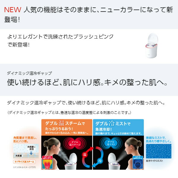 ◆ 主な特長 ◆◆ 主な仕様 ◆電源方式交流式スチーム・ミストの種類ナノサイズのスチーム急冷マイクロミスト潤冷風温冷ケア●アロマの香り●スチーム温度約40℃(ノズルガード先端から約20cmの距離)スチーム発生量約12mL/分(吹出口2個)ミスト発生量約4mL/分(吹出口2個)給水タンク容量約200mLスチーム・ミスト発生時間約3分〜約13分30秒(各コースによって異なります。