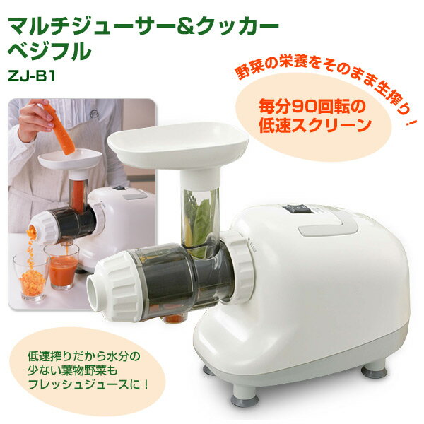 ゼンケン(ZENKEN) マルチジューサー&クッカー ベジフル ZJ-B1 本体サイズ 【本体のみ】幅26×奥行き17.5×高さ21.5cm【搾り出し部組み込み時】幅38.5×奥行き17.5×高さ32cm 重量5.5kg 材質 ABS樹脂、ステンレス他 仕様 ●原産国:韓国 商品説明 ●電源:AC100V(50/60Hz)●消費電力(50/60Hz):150/140W●コード長さ:約1.4m●定格使用時間:30分以下●セット内容:取扱説明書、レシピブック、ストレーナー2種、ノズル6種、ジュースカップ2個、こしアミ、押し棒、ブラシ●毎分90回転の低速スクリーンで野菜の栄養をそのまま生搾り!●低速搾りだから水分の少ない葉物野菜もフレッシュジュースに!●運転音もとても静か●ジュースと搾りカスが分かれて出てくるのでサラサラと飲みやすいジュースが作れる!●搾りカスが中にたまらないので連続での投入可能●ジューサー機能とクッキング機能(おろす、挽く、練る、混ぜる)の1台5役●野菜嫌いのお子様に、美容に気を使う奥様・お嬢様に、働き盛りのお父さんの健康管理に、固いものが苦手な方にオススメ●カッターを使用していないので、分解&お手入れも安全でラクラク●料理研究家フルタニマサエ先生監修の豊富なレシピブック付き 商品補足説明 YAMAZEN ヤマゼン 山善 通販 ゼンケン ZENKEN ジューサー クッカー VEGEFULL ベジフル 生搾り 野菜ジュース フレッシュジュース 新鮮ジュース 低速搾り 調理 クッキング 栄養 食育 ダイエット 健康調理家電 ランキング